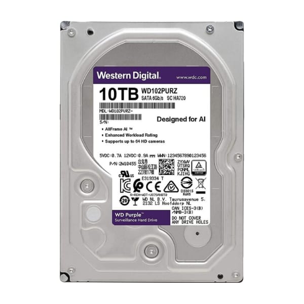 10TB CCTV Surveillance Hard Drive Built for 24/7, always-on, high-definition security systems. With a supported workload rate of up to 180 TB/yr and support for up to 64 cameras, WD Purple drives are optimized for surveillance systems. 10TB CCTV Surveillance Hard Drive. With support for up to 64 surveillance cameras per hard drive, WD Purple gives you the flexibility to upgrade and expand your security system in the future.
